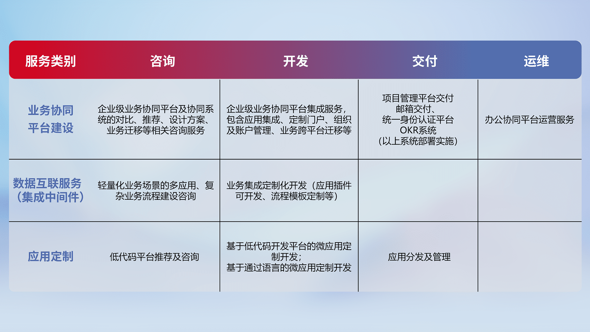针对钉钉、、、企微、、IDaas等平台级产品提供产品的规划、、、、方案、、、、交付、、、、定制化开发等服务,,实现如统一协同办公、、、、智能客户服务、、、混合会议管理、、、、智能数据查询、、、等业务场景,,实现数字化转型。。。。